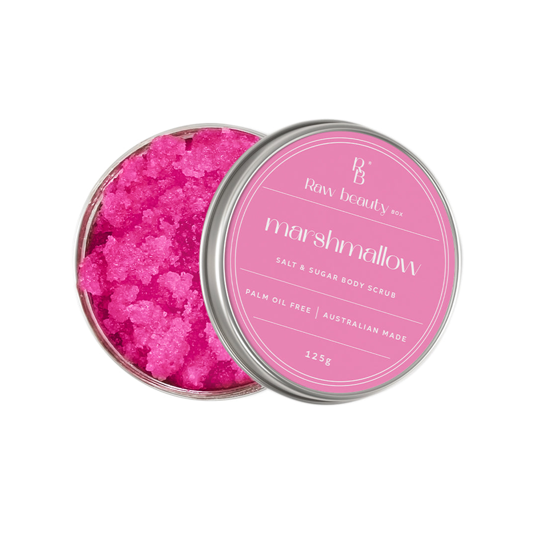 Wrapped in a sweet marshmallow scent, every shower feels like a treat. Our formula is chemical-free, vegan-friendly, and created without parabens or palm oil, so you can exfoliate confidently and keep your routine simple—no microbeads, no harsh chemicals, just natural ingredients that work for all skin types.